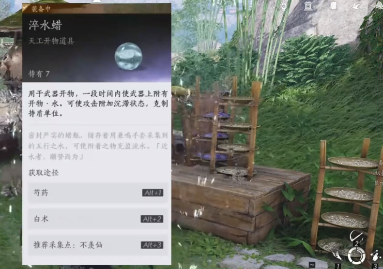 2、淬水蜡:这个道具的效果是给武器添加一个天物·水的效果,让攻击附带一个沉滞的效果,可以对带有盾的角色有好的克制效果。当道具等级达到2级后,可以在附带效果的阶段提高防御能力,3级的效果是延长附带效果时间10秒。这个道具可以在不羡仙附近的水域获得;