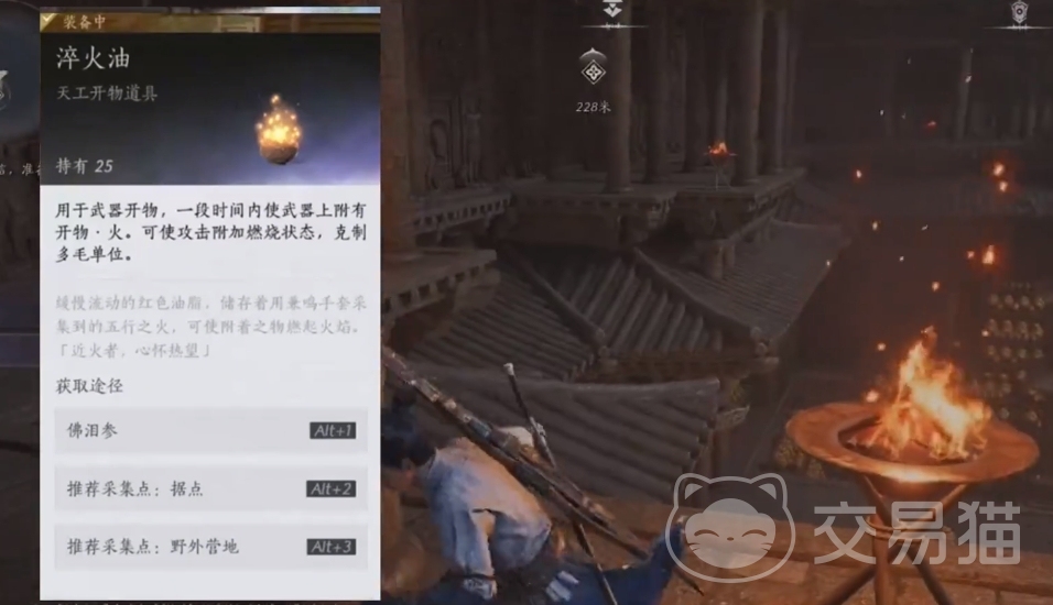 1、淬火油:这个道具的效果是给武器添加一个天物·火的效果,如果添加效果的武器在命中后会有增加1.1%的火焰伤害。不同等级的淬火油效果不同,2级的效果是在持续性攻击后可以造成爆炸伤害,3级的效果是可以增加火焰效果10秒。这个道具可以在野外营地的火堆中获得;