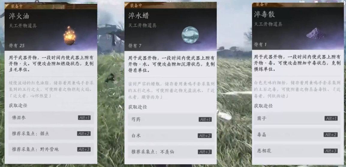 3、淬毒散:这个道具的效果是给武器添加了一个天物·毒的效果,让攻击附带一个中毒的效果,对于有横练效果的角色有克制效果,当道具到达2级后对命中的目标还会有额外伤害,当道具3级后可以延续10秒的时间。这个道具可以通过采集菌子或者是毒菌获得;