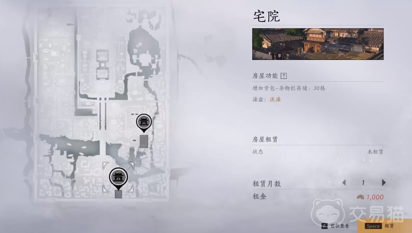 要开启家园功能,你需要先找到地图上的房屋租赁标识。目前,家园系统的触发点在开封府,玩家可以在这里的“牙行”开始自己的购房旅程。地图上会标出两个租赁点,分别提供不同类型的房屋供选择。便宜一些的居舍只需100钱,而更高级的宅院则需要1000短陌钱。