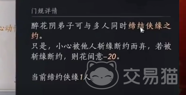 醉花音:按照规定弟子就需要和多个玩家一起去缔结约定,如果被斩断情缘的话,那么就会触犯门规会减少20个花间意。