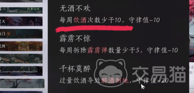 狂澜:主要是以军力立派,每一周喝酒时间不可以少于10次,并且还要求无论如何都不能喝醉,要是喝醉的话就会减少20个守律值。