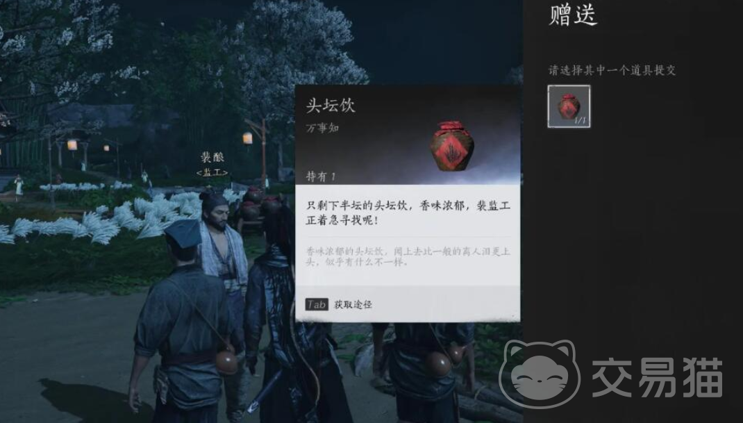 在提示当中需要玩家在存香塔的梨花树旁边找到一撮黄毛,这个黄毛其实是猿猴留下的线索,而通过这个黄毛玩家已经知道偷走头坛酒的是猿猴,然后玩家就根据猿猴留下的踪迹来到了花海右侧的山泉旁边,此时在石头上找到了被已经藏好的头坛饮,当玩家找到了头坛饮之后直接返回到存香塔下面,把它交给npc,就代表玩家完成了任务。