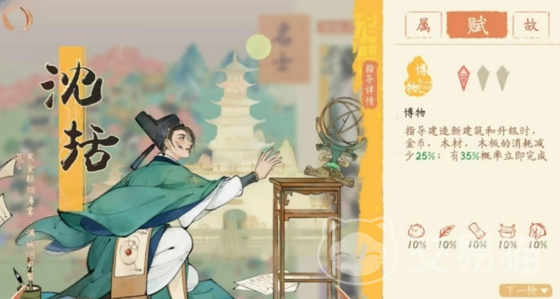沈括的天赋技能有30%的概率可以立刻完成,这里的意思是大概率为30%能够立刻满完成某项非常重要的建筑物,或者是直接将这个建筑物进行升级。由于玩家在完成建筑物或者是升级建筑物的时候需要时间等待,而这里的话,就可以缩短时间让整个游戏的体验感加强。