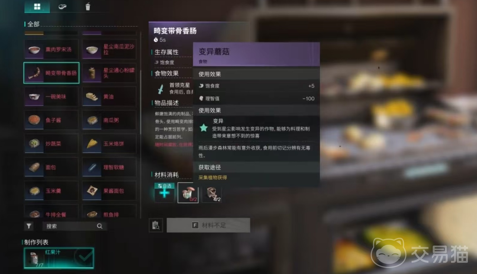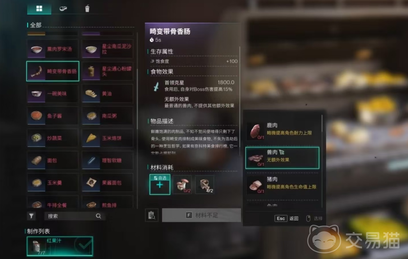 拿到食谱之后点击就能学会,然后回到自己的家中,在高级灶台上进行烹饪。因为该烹饪是属于紫色品质,所以在效果以及食材需求方面都比低等级的食谱更多一些。它需要使用到变异蘑菇两个,香料4份,还需要一份任意品质和种类的肉类,肉类可以是鹿肉、猪肉、鳄鱼肉等,大家根据自己的实际储备情况来进行选择。