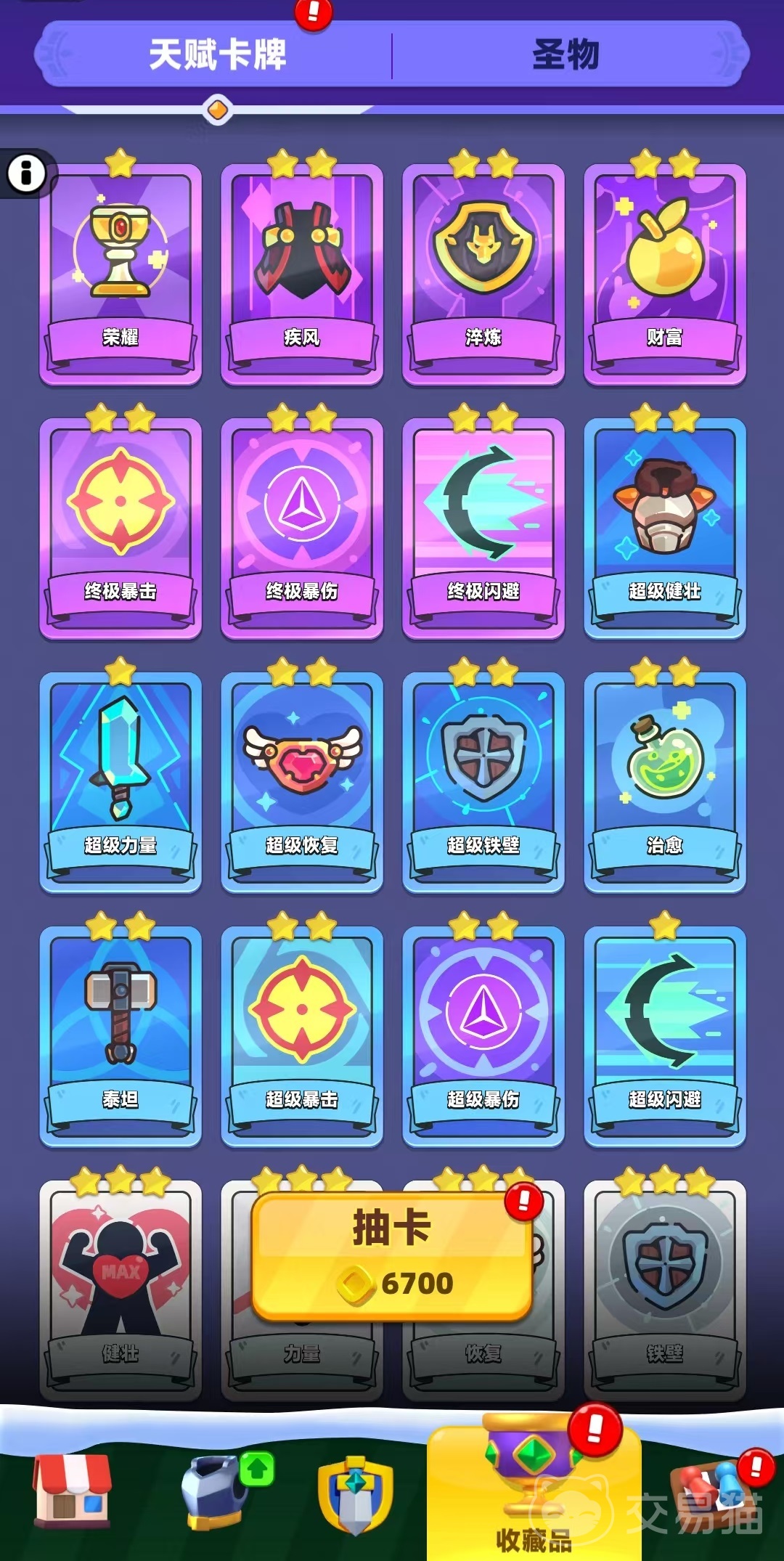 如果想要提高生命值,大家需要进行基础属性提升,首先来到天赋卡牌这里,在天赋卡牌中都是各种属性加成,其中就有生命值方面的提升,例如超级健壮,就可以提高最大生命值,还有其他的卡牌,例如泰坦,能够增加最大生命值、攻击力和暴击伤害。天赋卡牌最初抽到的都是低品质,后续抽到同名同品级的就能进行合成,合成之后星级提升附加的属性提升。