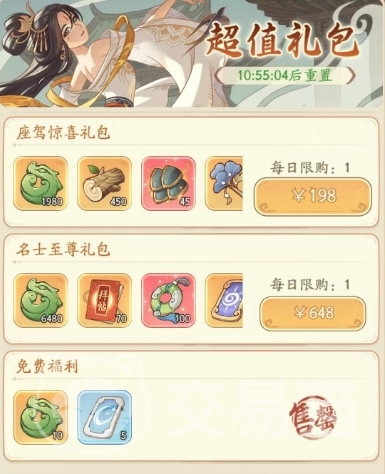 如果大家不想一次花这么多去购买月卡或者终身卡的话,游戏中还有一个超值礼包系统,大家可以在上面看到价格不一的礼包,基础的礼包价格低,但是给出的其实都是一些基础的资源,比如时代助理礼包最后价格只要6,但是给的就是60玉璧、40户口簿以及80地契,这个性价比不高,就是占了价格低的优势,其实这样的礼包如果大家只是想充值玉璧的话,还是可以考虑的,其他礼包里面赠送的道具就当是赠品。