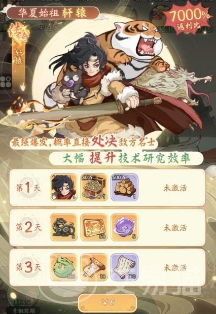首充6块钱的礼包还是比较推荐大家去氪的,这个首充礼包当中是包含了三天的连续奖励,第一天有木材资源以及铜币资源,可以用来给角色升级以及给建筑升级,而最重要的其实还是送的这个角色轩辕,作为传奇角色强度绝对是足够大家用了,第二天则是资源加速卡以及一些给武将升级的资源,包括了虎符,还有体力丹可以让大家快速恢复体力,有体力就可以再次去巡视了,第三天是消耗资源,有大家能用的货币玉璧,以及游戏中消耗用的通商急诏,用来加速商会的通行速度,最后是商贸批文,后期大家升级商会的时候需要消耗的道具,因为价格不高,但是给的东西多,所以目前其实还是比较推荐大家买这个首充礼包的。