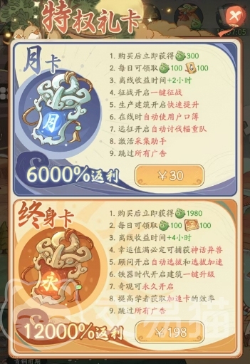 其次就是特权礼包,也就是月卡,目前的月卡是可以按月购买或者是直接购买一个终身卡的,月卡是30就可以卖到,有6000%的返利,而终身卡则是12000%的返利,价格也要贵一些需要198,但是带来的特权都是不一样的,月卡带来的特权是购买后立即获得300玉璧;月卡激活期间每日可领取100玉璧以及100户口簿;离线收益时间+2小时;征战开启一键征战;生产建筑开启快速提升;在线时自动使用户口簿;远征开启自动讨伐辎重队;激活采集助手;跳过所有广告。