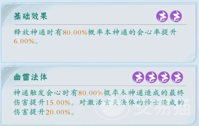 雷修的核心在于暴击率的提升,所以搭配的神通有这方面加成的话,就可以让雷修玩家能够在短时间内给敌人造成大量伤害,每一招出手都特效炸裂,带来一招制敌的快感,当雷修派系装备四个雷系神通后,可以激活幽雷法体,激活幽雷法体后,在神通触发会心时,有80%的概率使本神通造成的伤害提高15%,这意味着堆高会心值能够在战斗中打出更高的伤害。