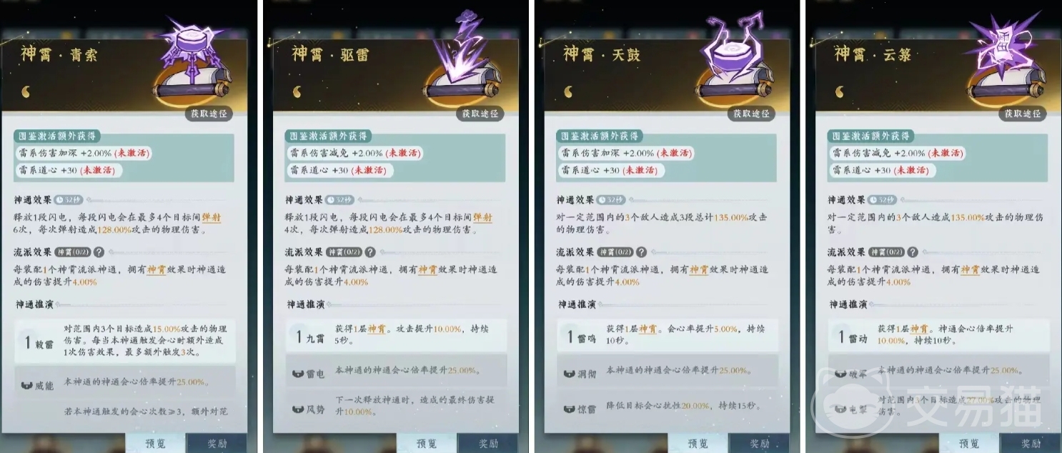 神通效果会对最多3个敌人遗成135.00%攻击的法术伤害,可以重复命中相同目标,释放1段闪电,每段闪电会在最多4个目标间弹射6次,每次弹射造成128.00%攻击的法术伤害,对一定范围内的4个敌人造成4段总计128.00%攻击的法术伤害,最后一个神通是对一定范围内的3个敌人造成135.00%攻击的法术伤害,神通达成雷鸣之后,会随机释放1~3次落雷,每次释放对目标造成16.100%攻击的法术伤害,会心率提升1雷鸣5.00%,持续10秒时间。