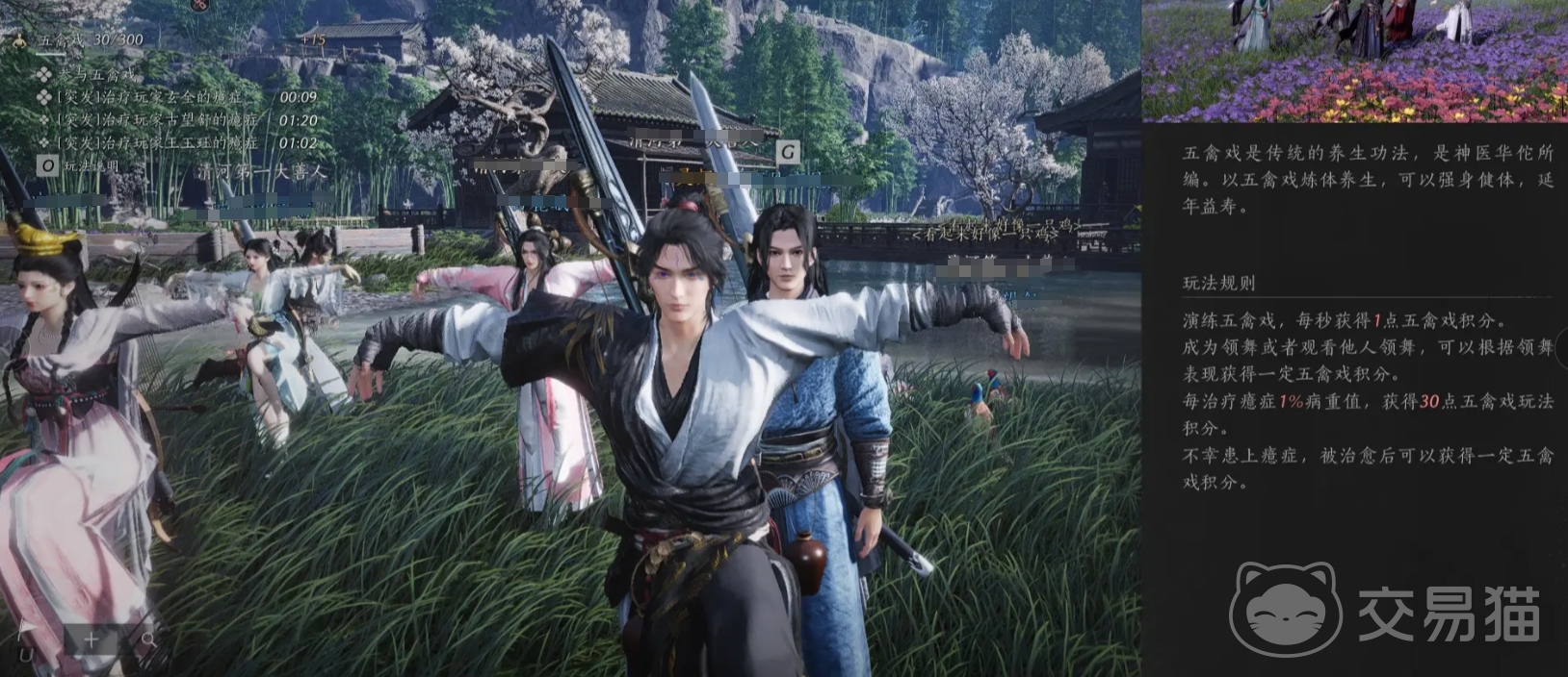 接着,玩家通过练习五禽戏来累积五禽戏积分,每过一秒,积分就会增加一点。若玩家成为五禽戏的领舞者,将额外获得观众给予的积分;而作为观众,同样可以根据表演者的精彩程度给予积分。积分的多少直接影响玩家在五禽戏玩法排行榜上的位置。