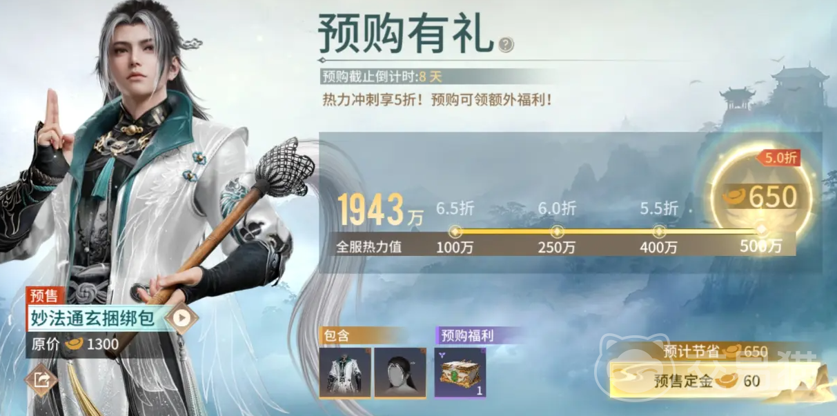 在活动期间还会开启无尘的特殊外观妙法通玄的礼包。咱们如果对这个外观有兴趣的话可以前往商城参与预购,如果预购达到指定人数的话,那么最高可以享受到5折的优惠。
