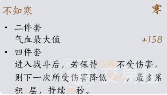 不知寒套装:二件套效果是气血最大值增加158点,四件套效果是进入战斗后,若保持15秒不受伤害,则下一次所受伤害降低50%,最多累积两层,持续30秒。