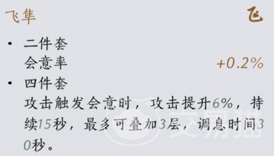 飞隼套装:二件套的效果是增加0.2%的会意率,四件套的效果是每次攻击触发会意时,攻击力提升6%,最多可以叠加三层,持续15秒,调息时间为30秒。