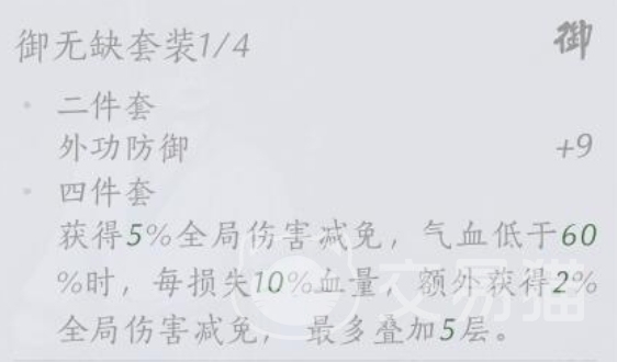 御无缺套装:二件套的效果是外功防御增加9点,四件套的效果是获得5%的全局伤害减免,当气血低于60%时,每损失10%的血量,就会额外获得2%的全局伤害减免,最多叠加五层。