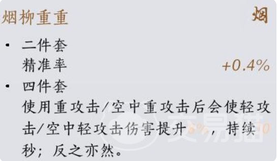 烟柳套装:二件套的效果是精准率提高0.4%,四件套的效果是使用重击,或者是在空中达成了重击机制之后,还可以给此类的伤害提升输出数值达到8%。