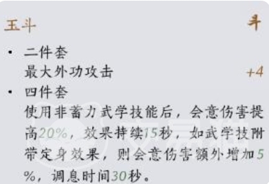 玉斗套装:二件套效果是增加4点最大外功攻击,四件套的效果是在使用非蓄力的武学技能后,会意伤害提高20%,持续15秒,如果技能还具有定身效果,则会意伤害额外增加5%,调息时间为30秒。