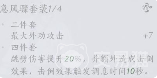 急风骤套装:二件套的效果是最大外功攻击增加7点,四件套的效果是跳劈伤害提升20%,并额外造成击倒效果,击倒效果触发后的调息时间为10秒。