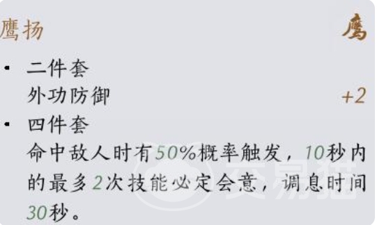 鹰扬套装:二件套的效果是外功防御增加2点,四件套的效果是命中敌人时有50%的概率触发,使得接下来10秒内的最多两次技能必定会意,调息时间为30秒。