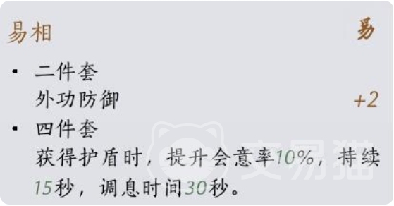 易相套装:二件套的效果是外功防御增加2点,四件套的效果是获得护盾时,会意率提升10%,持续15秒,调息时间为30秒。