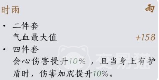 时雨套装:二件套的效果是气血最大值增加158点,四件套的效果是会心伤害提升10%,并且当角色身上有护盾时,伤害加成再提升10%。