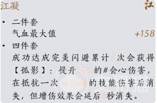 江凝套装:二件套效果是气血最大值增加158点,四件套的效果是成功达成完美闪避累计5次后获得孤影效果,提升10%的会心伤害,该效果在抵抗一次可化解的技能伤害后消失,但增伤效果会延后8秒消失。