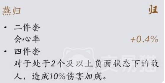 燕归套装:二件套的效果是增加0.4%的会心率,四件套的效果是对处于两个及以上负面状态的敌人造成10%的额外伤害。