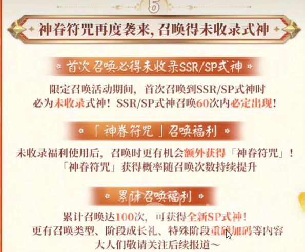 “祈福庆典”阶段是这次春节活动最具吸引力的环节之一。从1月15日开始,只要上线,每天最多可以领取10次免费召唤机会,而且保底必得SSR或SP式神。这么香的奖励,不薅简直对不起策划的好意。如果你还在担心运气问题,不妨提前规划一波召唤资源。官方还贴心地准备了70抽的保底奖励,届时SP紧那罗入手难度大大降低。总之,这波活动就是让你零负担过新年,欧气满满迎新春!