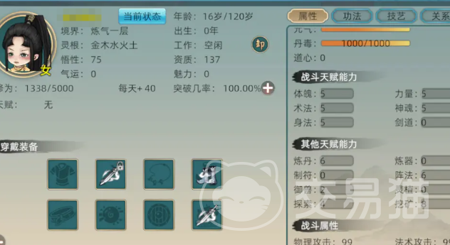 游戏一开始玩家就应该注重于双灵根的选择,这就是一个含有水属性的双灵根。在修炼的过程中就可以给玩家带来辅助性的帮助,如果是新手,建议挑选修仙一区。真仙模式虽然很好玩,可是难度比较大,可能就需要频繁的重生,对新手玩家而言根本就不合适。灵石是游戏中一种重要的货币,主要是用来购买各种不一样的材料和设备。