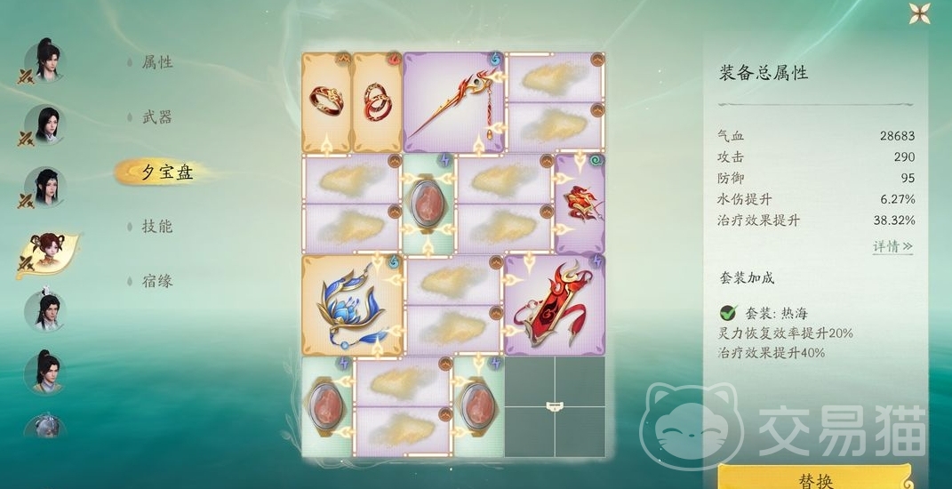 夕宝盘系统是仙剑世界的一个特色系统,根据各种装备和道具的合理布局,可以激活鉴定灵纹效果,进一步提高角色的属性。夕宝盘有六个装备位置,每个位置对应不同的装备类型。玩家必须灵活安排道具和装备的使用,以达到最高属性效果。