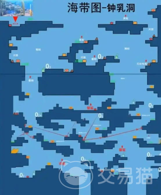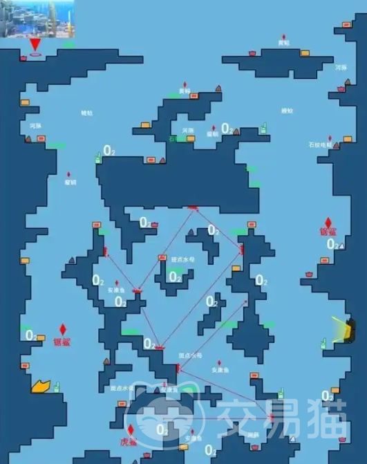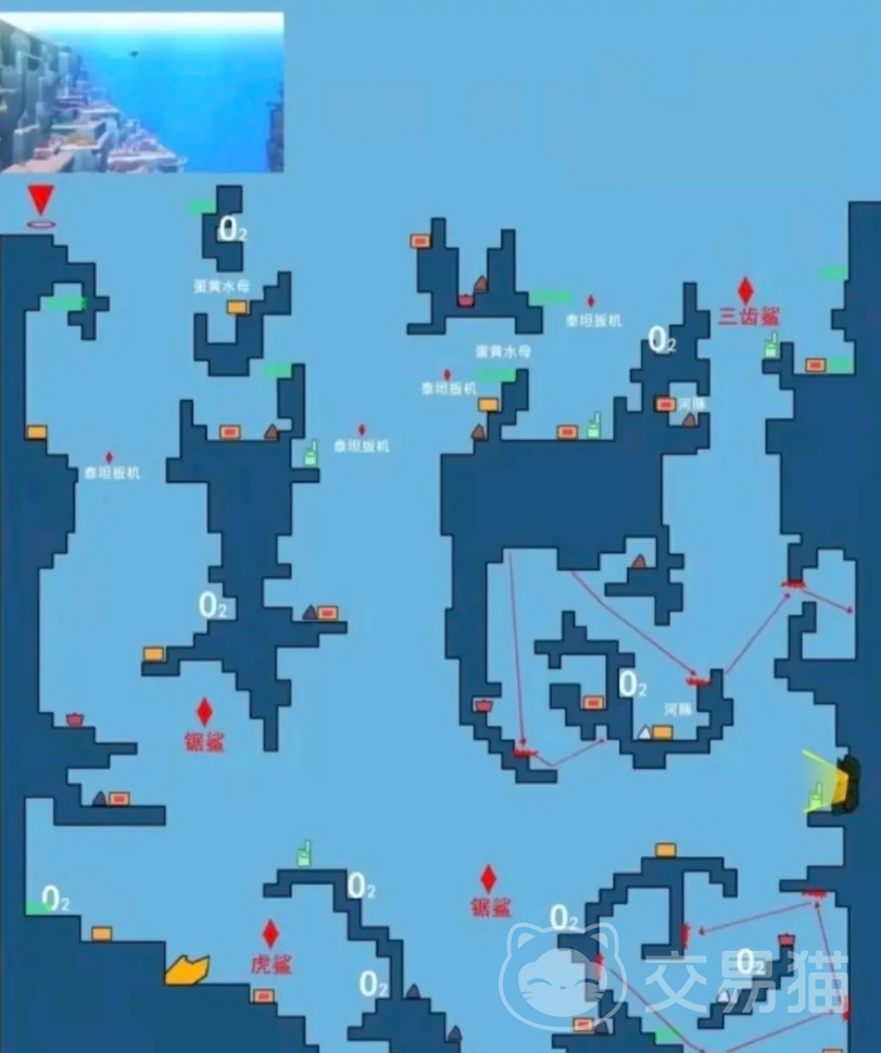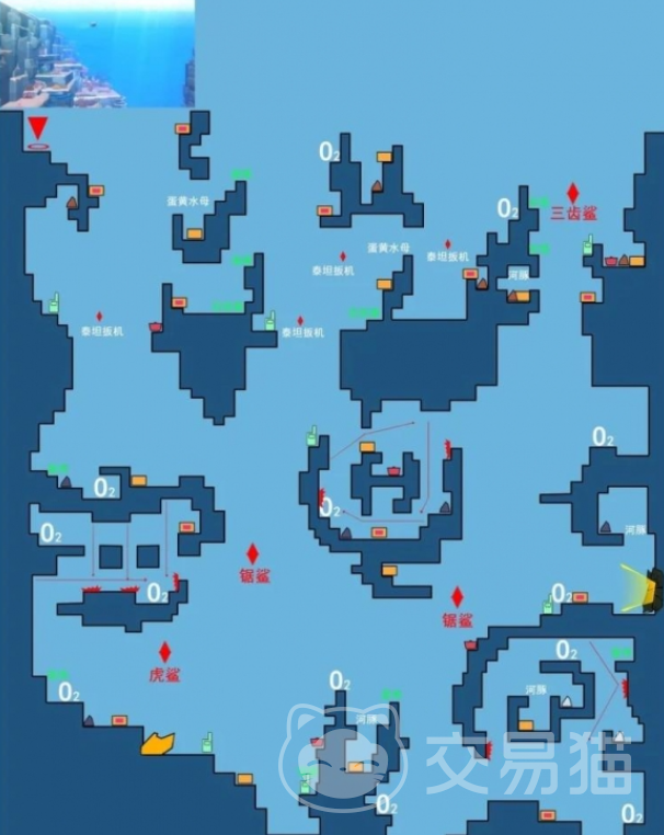 当玩家们在潜水的时候有两个比较重要的事项,第1个是需要注意避开比较危险的海底动物,这些动物很有可能会直接让你葬身海底,因此小编也在文章里面把这些动物有可能会出现的位置用红字给标注了出来,小伙伴们需要格外的注意,第2个就是在潜水的时候,玩家们也需要及时的补充氧气,而补充的位置小编也在图片中进行了标注,大家可以直接前往这些地方,然后在这里的黄色电池处补充氧气,继续潜水。