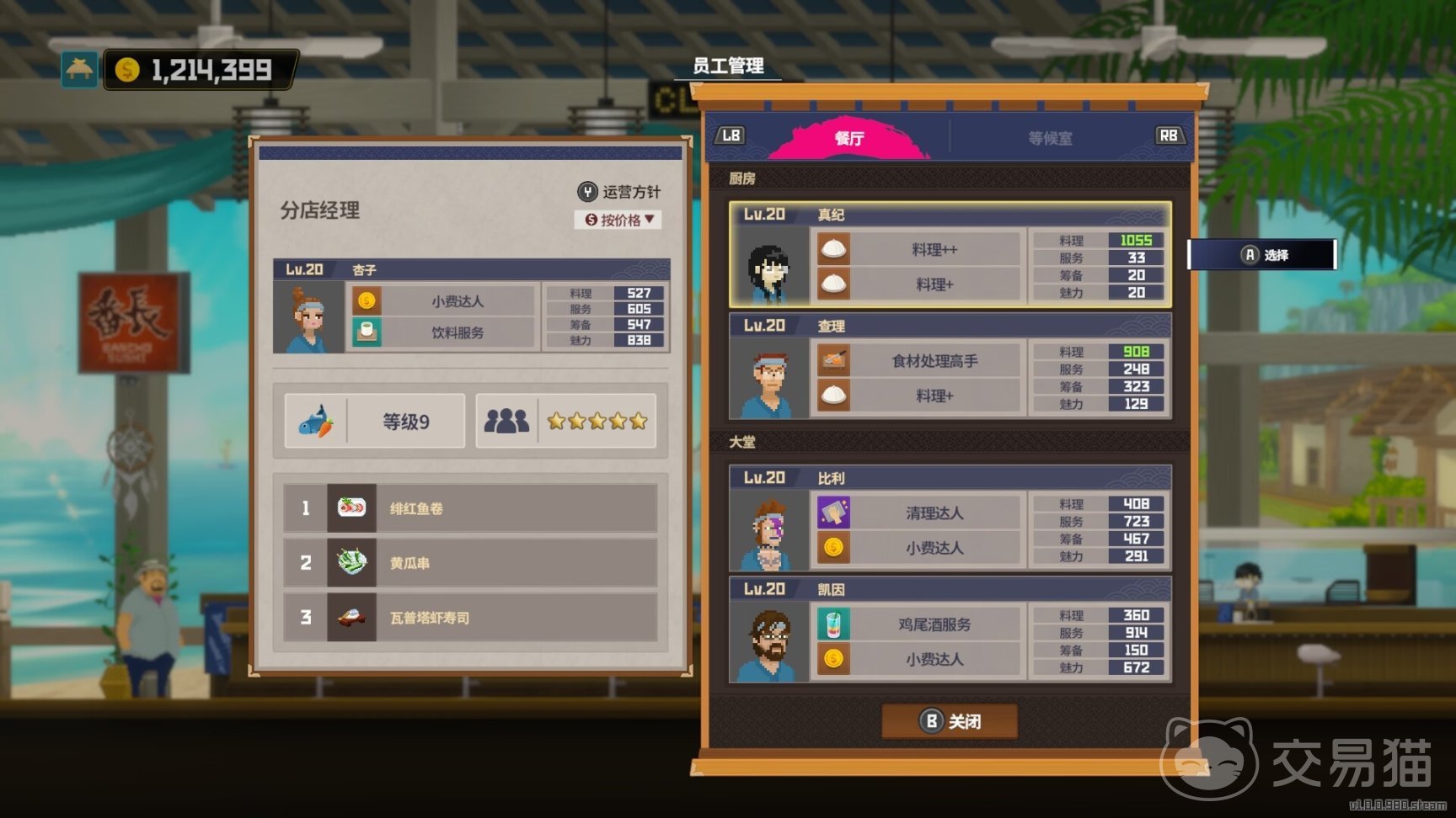 当寿司店发展到分店阶段,团队的搭建则需要更全面和稳定的组合。此时,德瑞依然是最适合担任分店经理的候选人。他的多面技能和高效服务属性,使他能统筹分店的运营,保证菜品供应与顾客服务的平衡。厨房依旧可以由真纪和查理搭档。查理虽然属性不如真纪,但他的稳定性在分店环境中尤为重要,两人协作能够确保菜品供应的连续性和品质。大堂方面,凯因和比利是最佳选择,他们不仅清理速度快,还具备额外的小费增益技能,为分店带来更多的盈利空间。而在特殊派遣任务中,达比纳和正义则是最值得信赖的员工。如果资源不足,裕介和派也可以作为替代人选,虽然表现稍逊一筹,但在特定任务中同样能够发挥作用。