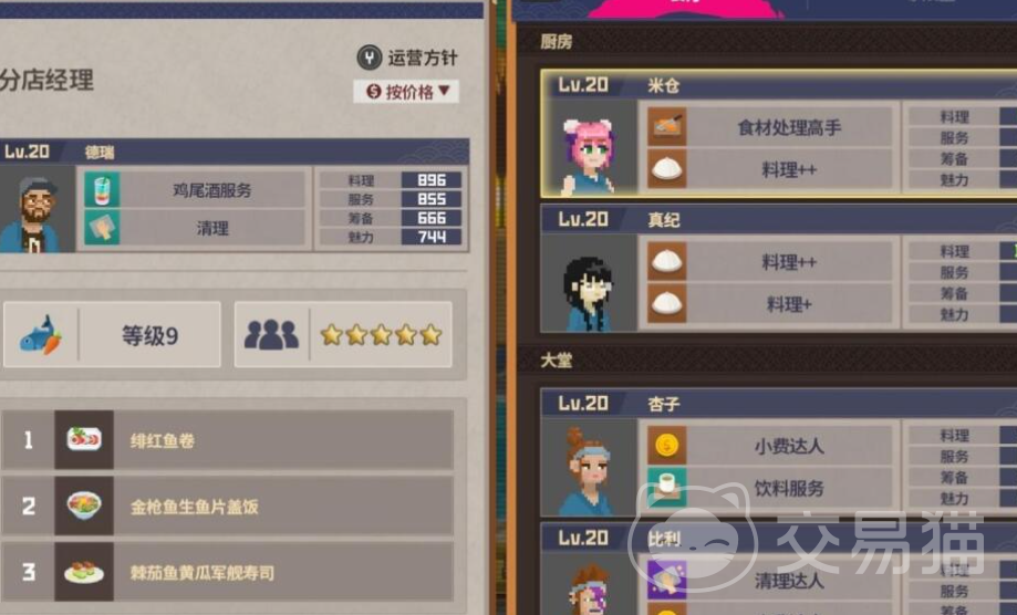 在料理这方面,小编为大家推荐的食材是绯红鱼卷,这道菜不仅可以从游戏的中期卖到后期,并且食材的获取方式也是相当容易。而员工的话比较建议大家把比利给招进来,因为当他拉到15级之后,就会成为店里面的核心员工。