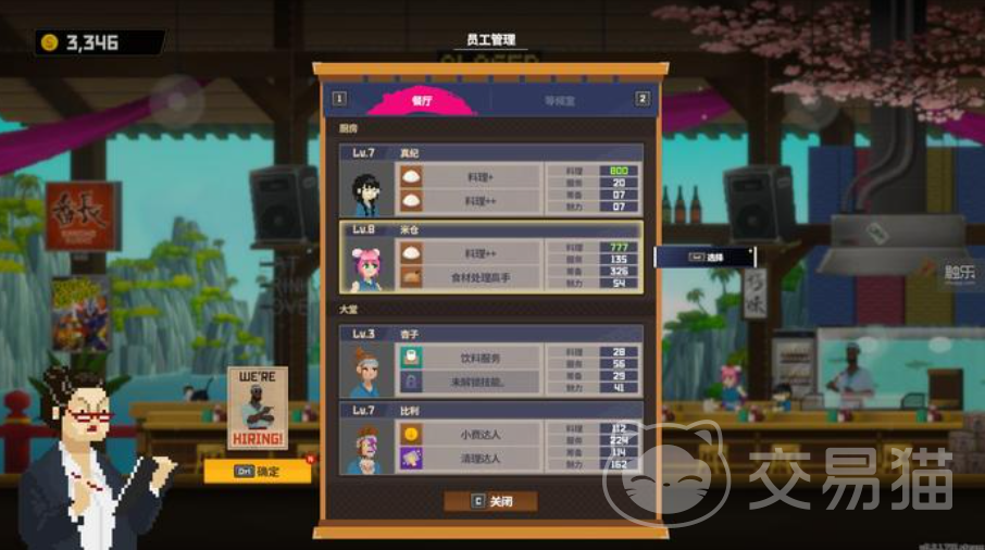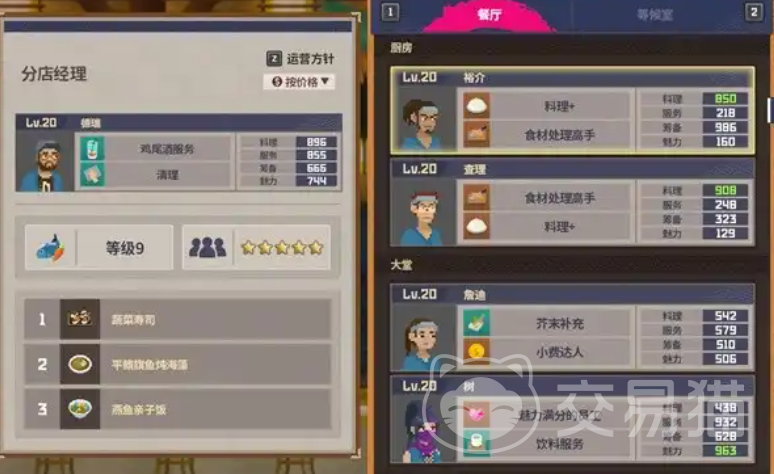 而在大堂经理的选择上,其实最重要的是清理度,小编建议大家在每个店放两名清理度拉满的员工,因为大家在游戏的过程中会发现脏盘子一直都是扎堆出现的,如果你只有一个能力拉满的员工,其实是来不及清理的,这就会导致很多客人都跑掉了,因此小编建议大家直接放两个,至于鸡尾酒技能可以放在后面考虑。