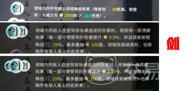 第三层剑魂则是要玩家每次使用绝技知识在该领域内的敌人可施加一月裂魂效果。每层可降低80点的防御,同样可叠加十层。