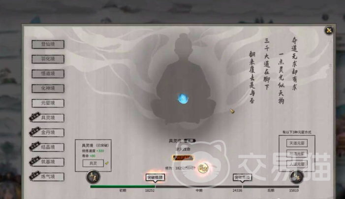 首先来看大的境界,目前十个大境界分别是炼气境,筑基境,结晶境,金丹镜,具灵镜,元神境,化神境,悟道境,羽化境和登仙境。而这十个大境界每一个境界又被划分为前,中,后三大小境界,总共30个境界,玩家要想提升境界,就需要收集到相关升级所必须的材料和各种丹药完成一突破后,达到登仙境则可化身成仙,完成道法修炼。