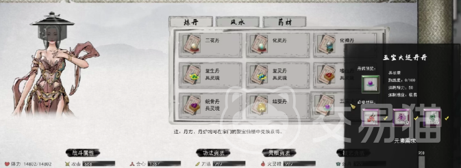 第二个丹药是五宝大还丹,在游戏当中五宝大还丹能够让一丝元魂的角色完成肉身重塑,简单的就是说就是可以复活别人。目前这个丹药的获得方法还是比较简单的,可以前往云陌州主城工坊进行炼制,不过主城的名字和位置是不一样的。玩家可以在小地图当中直接寻找主城标志进入即可进入到工坊后,点击五宝大还单的单方。在下方凑齐3750灵石,30个胭脂安息香、月阳根和五爪藤就可以开启五宝大还丹的炼制。