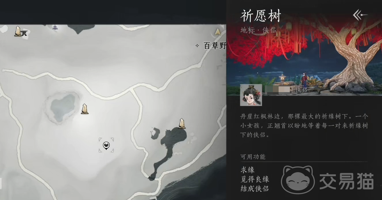 双方有了暮缘后,一起出任务刷副本,慢慢提升彼此的好感度,好感度达到一定数值后就可以缔结“侠侣”。双人一起组队前往祈愿树下完成“认证”。祈愿树是在“丹崖”,如图所示的位置。