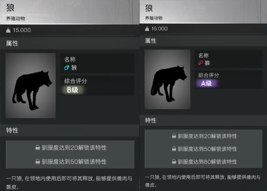 首先大家需要了解不同级别动物的基本特性,因为游戏中野外的动物分为S、A、B、C四个等级,其中S级动物能够进行最多7次繁育,而品级越高,解锁的词条属性也越多,最多可达4个,因此在选择繁育对象时,优先考虑高品级的动物将有助于提高获得优质后代的机会,其次提升动物的驯服度,只有当动物的驯服度达到80%以上时,它们才有可能进入求偶状态,在这个状态下,如果家中有一公一母两只符合条件的动物,就可以让它们在幼崽小屋内产生幼崽。