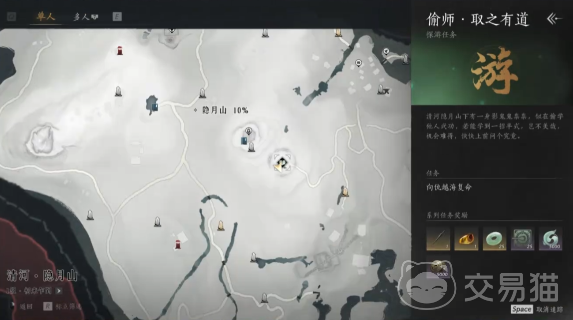 首先,先在清河的隐月山位置查找,会看到有一个标志是偷的任务,名字叫做偷师·取之有道,这个就是能拿到钥匙的任务,点击追踪以后会把大家引到一个叫做仇越海的NPC处,到达他那里以后他就会教大家要怎么偷师,并会进行下一步任务的提示。