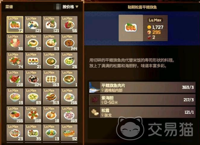 旗鱼料理分为酱烤条纹四鳍旗鱼、平鳍旗鱼炖海藻两种,分别需要四鳍旗鱼和平鳍旗鱼作为主素材,其他材料还需要大蒜、大酱、南部黄牛昆布、甘苔、酱油等辅助材料,南部黄牛昆布需要在冰河区域开启后传送过去收集,酱油通过员工派遣的红色料理锅概率获得,平时也应该注意收集这些辅助材料,让料理的制作更加轻松。