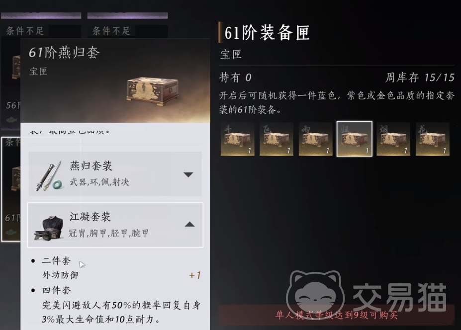 江凝套装的二件套效果同样是“外功防御+1”,四件套则赋予闪避型玩家更强的续航能力:完美闪避敌人攻击时,有50%的概率回复3%最大生命值和10点耐力。这是一套闪避续航类型的防具,适合各类流派使用,尤其是对操作要求较高的打法,能够为玩家提供持续作战的能力。