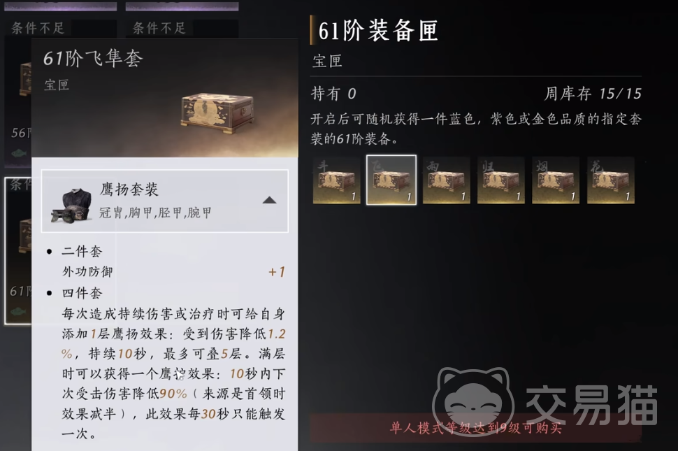 鹰扬套装的二件套效果是“外功防御+1”,而四件套的强力加成则是:每次造成持续伤害或治疗时,可叠加“鹰扬”效果,每层减少1.2%受到的伤害,持续10秒,最多可叠加5层。当叠满5层后,会触发“鹰护”效果——在接下来的10秒内,下一次受到的伤害降低90%(如果来源为首领则减半)。此效果有30秒的触发冷却时间。这是一套高频减伤的防具,非常适合PVE和PVP,通用性极强,尤其推荐新手玩家使用。