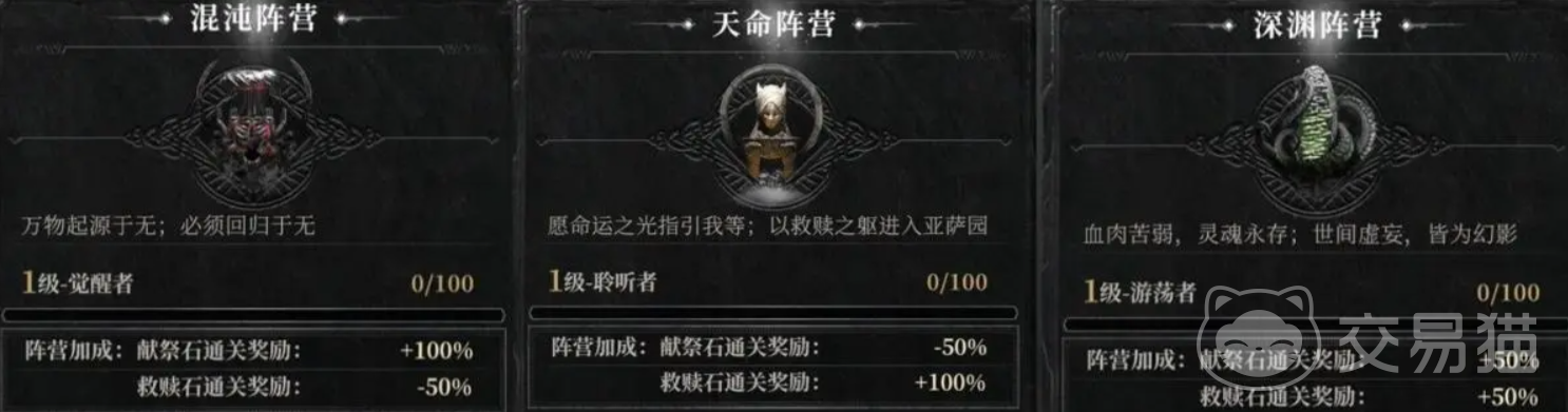 萌新刚一进入就需要挑选自己的阵营,分别是红色的混沌阵营、黄色的天命和绿色的深渊,选择上的不同会和之后的献祭与救赎玩法产生联系,每次关卡获胜后会有对应的加成,具体的加成大家可以看下图,举个例子来讲,如果加入红色,那么之后每次作战时选献祭,就会拿到加成,如选择救赎就会让关卡奖励减少50%。