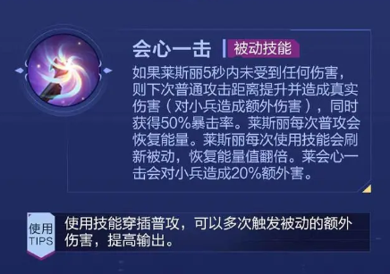 ②技能介绍。其被动技能为会心一击。若莱斯丽在1.5秒内未受到任何伤害,则下次普攻距离提升,并且造成真实伤害,同时提高50%的暴击率。使用技能后会刷新这个被动。其一技能为伪装大师。莱斯丽进入伪装状态,期间加快能量恢复,提高移速和物理攻击。但受到伤害或自己对敌人造成伤害时,伪装状态会被解除。二技能为战术手雷。向前方投掷手雷,使命中的敌人受到伤害并被击退,同时莱斯丽也会向后方小幅度后退,这个后退能穿越一些墙体,可用于逃脱或追击。三技能(大招)为终极狙杀。锁定一位敌人发射出四枚终极子弹,每一发造成伤害的同时还会附加目标已损失体力值20%的物理伤害。这个子弹可以被敌方其他英雄阻挡。