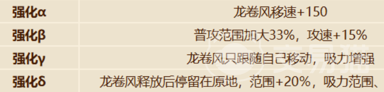 在改造时可以选择多个路线,例如选择强化α,可以有效让龙卷风的移动速度增加150,在清理分散的怪物时还是非常有用的,能够很快进入到敌人的周围,然后展开输出。