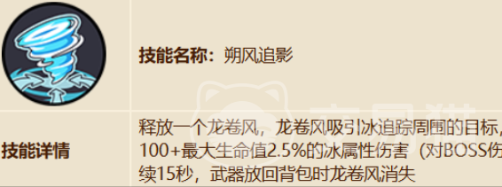 首先了解一下这把武器的基础性属性,移动速度可以增加100,会有250点冰攻击,一旦在释放攻击之后就可以把周围的敌人全部都吸附柱。朔风追影这一个技能一旦在释放之后还会形成一个龙卷风,会有15秒的时间。基本上每相隔半秒就会造成将近100点的基础性伤害,而且还会有冰属性伤害。