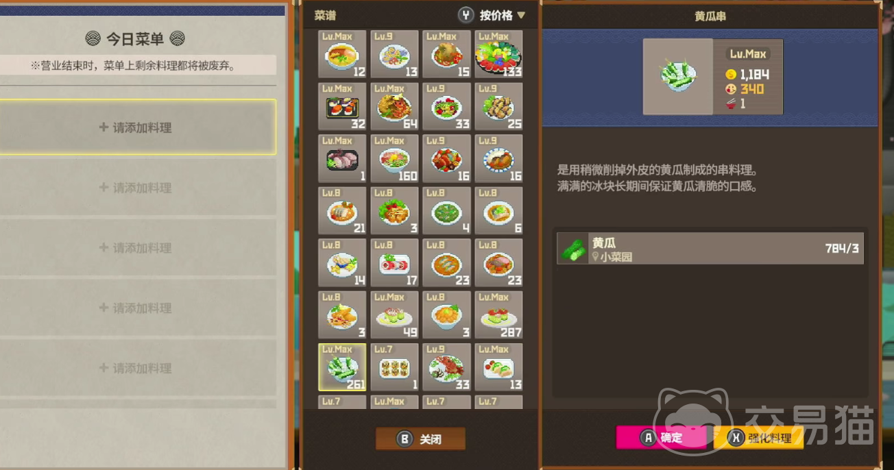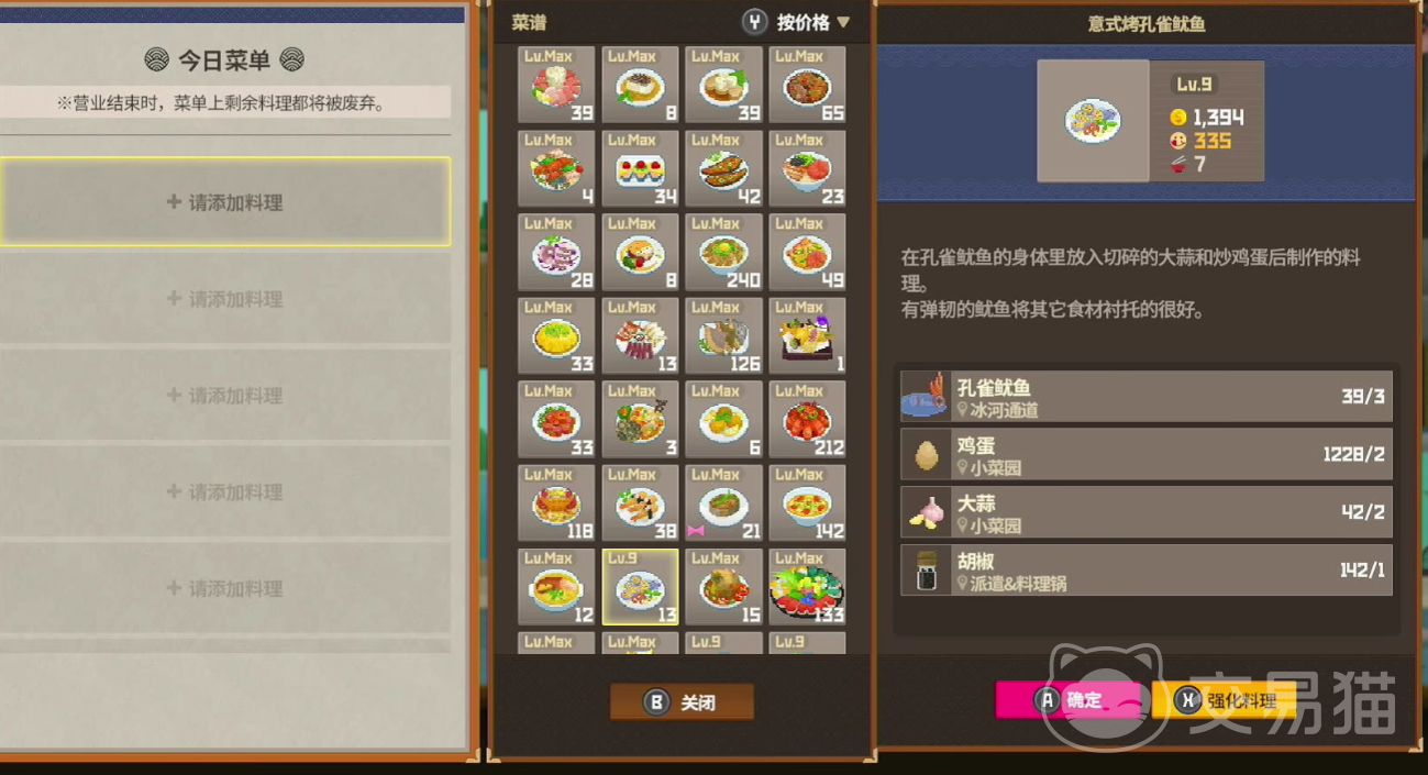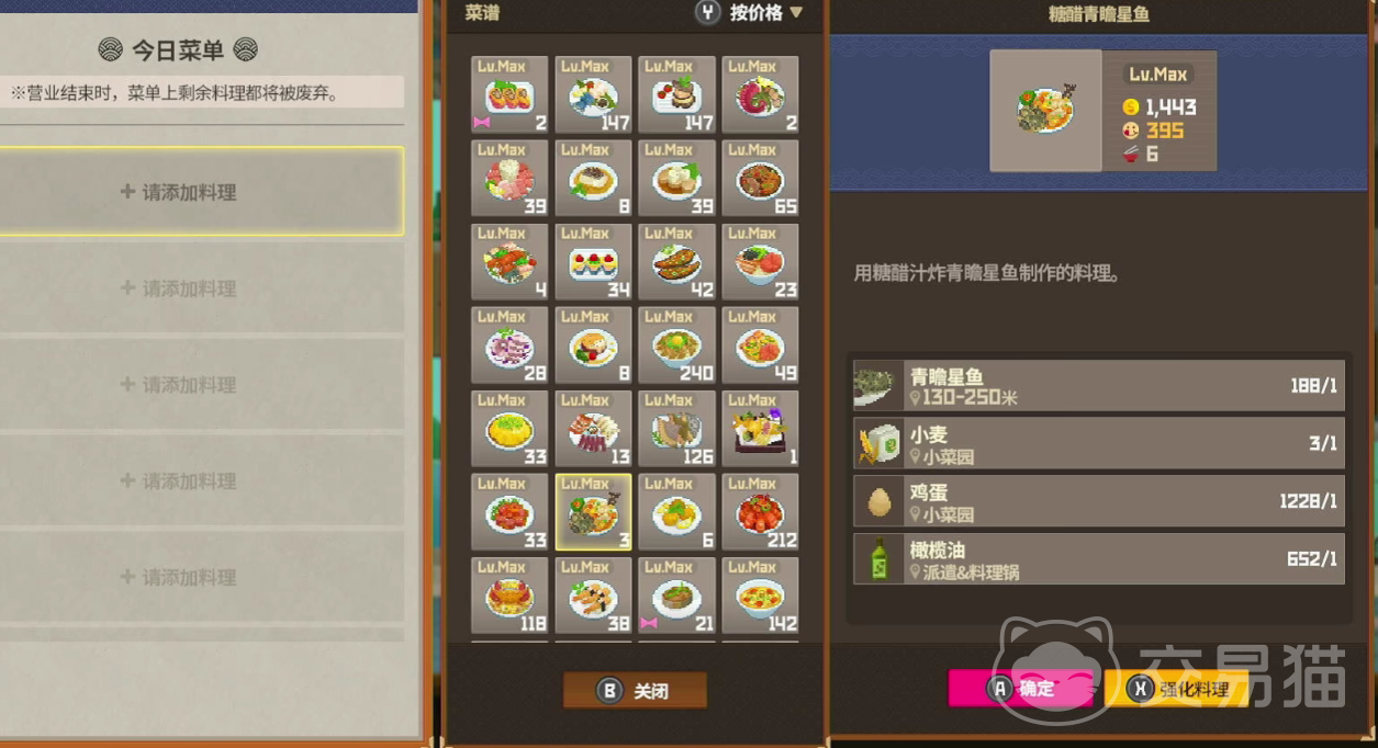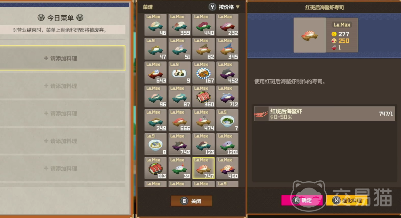 除了以上这三个菜品以外,玩家在前期还必须升级自己的咖喱制作水平,由于前期可供玩家捕猎的鱼类是比较少的,大部分的食材都是水母或章鱼,而咖喱是可以完美搭配所有菜系的,如果玩家某个季节的收成不足,也可以使用咖喱来扛过晚上的经营时间。