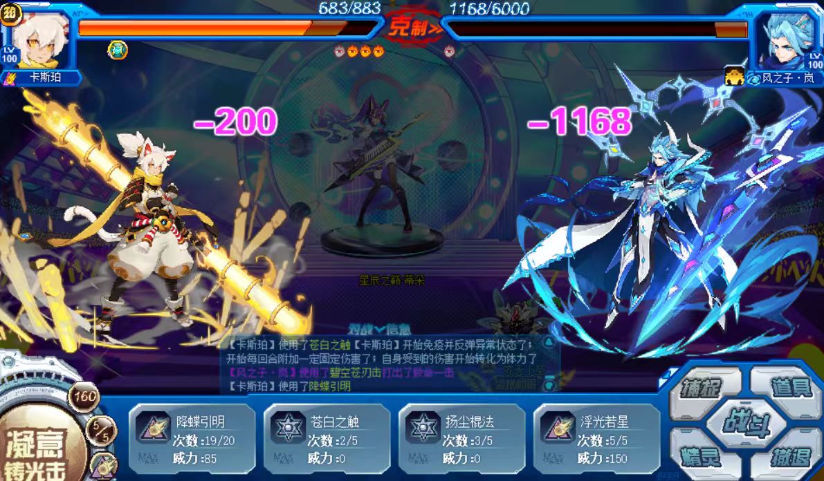 在整个战斗中,一共需要面对5个不同的boss,难点就在于第4个和第5个,只要这两个能够打过,其他的是比较简单的。第1个遇到的是岚,他每回合吸血200,只会受到水、火、草系技能伤害,强化技能有引爆效果。打法有两个,第1个是用送草王保卡斯铂,开出免伤后慢慢去打,第2个是采用四九单挑,当然也可以用自暴加上水火草系强攻精灵来打。
